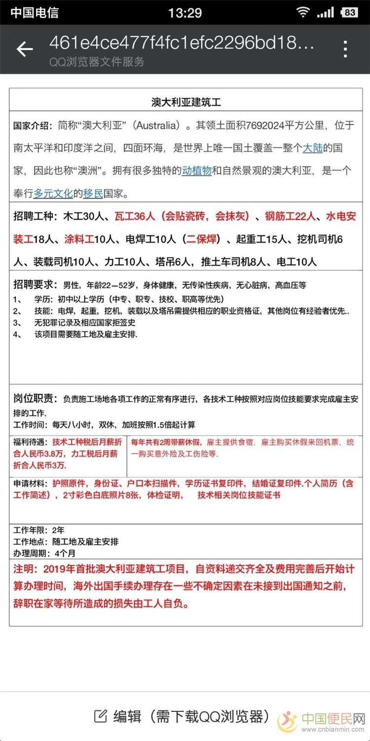 公司承诺、保障资金安全/协助处理境外相关事宜本公司专业办理出国劳务,国际劳务,公安部备案跨国完全委托和指定我司独家为其在国内长期招聘劳务人员,我公司拥有海外资深集团各类劳务项目一手资源,长期以来深受澳洲和国外雇主的青睐和信任,合作代理精英遍布全国各地,能高效准确的为海外雇主输送各类优秀专业劳务人才!澳大利亚合作项目:建筑、森林、工厂、农场、...